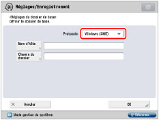 Les informations saisies aux étapes 6 à 9 de Réglages administrateur sont affichées dans [Nom d'hôte] et [Chemin du dossier].