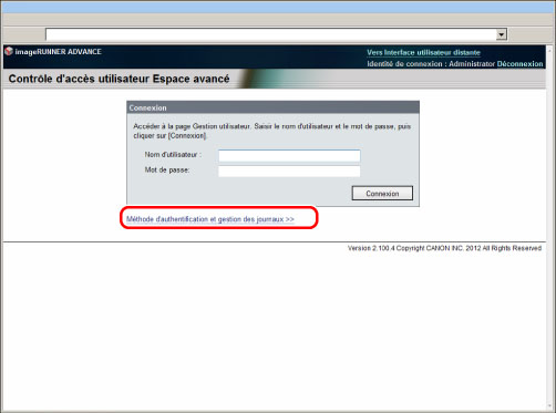 Il est également possible de se connecter en saisissant l'URL de la page [Contrôle d'accès utilisateur Espace avancé] dans la barre d'adresse, comme indiqué ci-dessous (sensible à la casse).