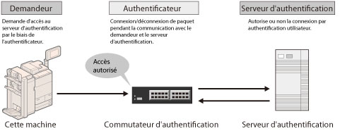 Gère toutes les informations d'authentification par l'intermédiaire du serveur d'authentification (RADIUS : Remote Authentication Dial In User Service, Service utilisateur entrant d'authentification à distance) et authentifie le requérant. Il est possible d'interdire un accès non autorisé parce que seul le demandeur authentifié par le serveur RADIUS est autorisé à se connecter au réseau par l'authentificateur.
