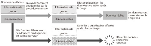 La machine sépare les données des tâches en informations de gestion et en données, et elle les stocke sous cette forme lors de la copie, de l'envoi, de la réception et de l'impression. Les informations de gestion sont effacées automatiquement une fois la tâche terminée, mais les données sont stockées sur le disque dur.