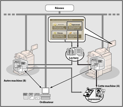 En sélectionnant l'espace avancé d'une autre machine imageRUNNER ADVANCE dans [Réseau], il est possible de lire un document avec cette machine et de le mémoriser dans l'espace avancé de l'autre machine imageRUNNER ADVANCE. Cette machine peut aussi être utilisée pour imprimer les fichiers mémorisés dans une autre machine imageRUNNER ADVANCE du réseau.