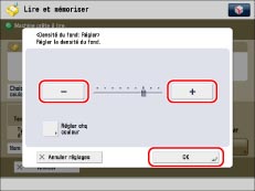 Si la densité de fond est réglée en appuyant sur [Régler] pour <Densité du fond>, le réglage [Auto] est annulé. De même, si l'on appuie sur [Auto] pendant les réglages manuels sous [Régler], les réglages sont annulés. La machine règle automatiquement la densité en fonction du fond.
