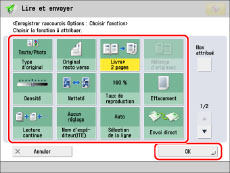 Deux raccourcis des options sont affichés dans l'écran Lire et envoyer. Les options définies par défaut sont [Original recto verso] et [Mélange d'originaux]. Ces raccourcis peuvent être modifiés pour des fonctions utilisées fréquemment.