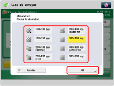 Si le format de fichier [OOXML] est sélectionné, on ne peut envoyer qu'à une résolution de [300x300 ppp] ou [600x600 ppp].