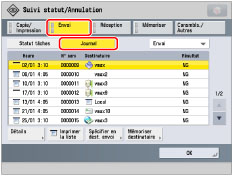 Permet d'afficher les informations détaillées relatives à la tâche sélectionnée. Vérifier les informations détaillées → appuyer sur [OK] pour revenir à l'écran Envoi.
