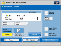 Pour imprimer souvent des fichiers en utilisant les mêmes réglages d'impression, il faut changer les réglages d'impression par défaut pour [Accès fich. enregistrés]. Pour plus d'informations, voir "Définition des réglages des fichiers enregistrés".