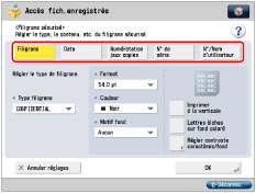 Le texte saisi dans [Personnalisé] n'est pas enregistré automatiquement. Pour sauvegarder les filigranes sécurisés venant d'être créés afin de les réutiliser ultérieurement si nécessaire, appuyer sur [Mémoriser] → saisir le texte à mémoriser.