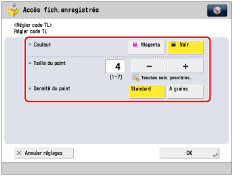 Il est possible de régler la taille, la densité et la couleur des points du code TL à intégrer à la sortie.