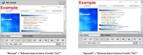 L'affichage de l'écran Web Access peut être modifié en fonction de vos besoins. Il existe quatre types d'écran qui peuvent être créés à l'aide de différentes combinaisons de réglages pour la taille d'écran et pour afficher/masquer la barre d'adresse.