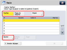 Il est possible de confirmer/modifier les réglages des intercalaires, des pages de chapitre ou du papier à onglets en appuyant sur [Détails/Modif.] après la sélection des réglages.