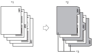 Si [Sortie forcée du papier à onglets non fini] est défini sur "Oui", les feuilles de papier à onglets en trop pour la tâche sont sorties de la machine.
