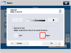 Si la densité de fond est réglée en appuyant sur [Régler] pour <Densité du fond>, le réglage [Auto] est annulé. De même, si on appuie sur [Auto] en réglant la densité manuellement sous [Régler], les réglages sont annulés. La machine règle automatiquement la densité en fonction du fond.