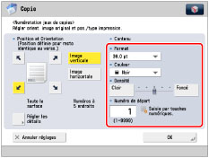 Si l'option [Option numérot.] est réglée sur "Oui", la taille des numéros de jeux de copies peut être réglée sur [10,5 pt], [12,0 pt] ou [14,0 pt]. (Voir "Options de numérotation des jeux de copies".)