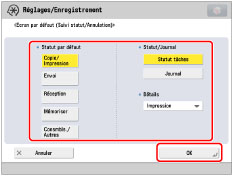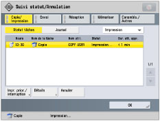 Si [Copie/Impression], [Statut tâches] et [Impression] sont définis comme Ecran par défaut (Suivi statut/Annulation) :