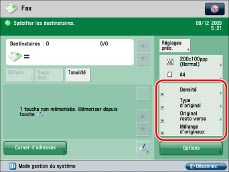 Il est possible de mémoriser des réglages dans les touches de raccourcis affichées à l'écran Fax. Jusqu'à quatre touches souhaitées peuvent ainsi être mémorisées dans [Options].