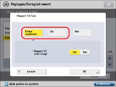 Pour faire figurer une partie du document envoyé dans le Rapport TX Fax, sélectionner [Oui] sous <Rapport TX avec image>.