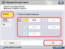 Si [Quotidien] est sélectionné, choisir un chiffre ([1] à [5]) → saisir l'heure de fin à l'aide des touches numériques