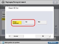 Le Rapport RX Fax permet de vérifier si des documents ont été envoyés correctement de la machine émettrice et bien reçus sur la machine du destinataire. Il est possible d'imprimer automatiquement ce rapport suite à la réception de documents et de régler la machine pour qu'elle ne l'imprime qu'en cas d'erreur de réception.