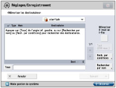 Si la carte fax est installée ou si le Kit Remote Fax est activé : noms, adresses e-mail et numéros de télécopieur