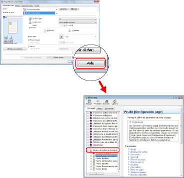 Les écrans ci-dessous présentent les instructions pour afficher la section consacrée au "Dépannage" du pilote d'imprimante.
