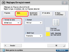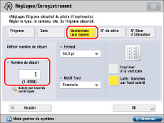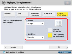 Pour plus d'informations sur la saisie des caractères, voir "Saisie de caractères sur l'afficheur tactile". Si des caractères sont mémorisés dans [Enreg. caractères pour Num. pgs/Filigrane] dans [Réglages de fonction] (Réglages/Enregistrement), il est possible de sélectionner les caractères dans la liste.