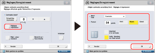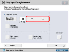 Une augmentation de la valeur de [Régl. valeur standard] a pour effet d'augmenter la densité du fond et une réduction, de la diminuer. Lorsque [Lettr. blanches sur fond coloré] est sélectionné, une augmentation de la valeur standard a pour effet d'augmenter la densité du fond et une réduction, de la diminuer.