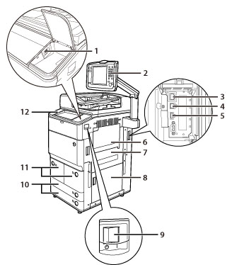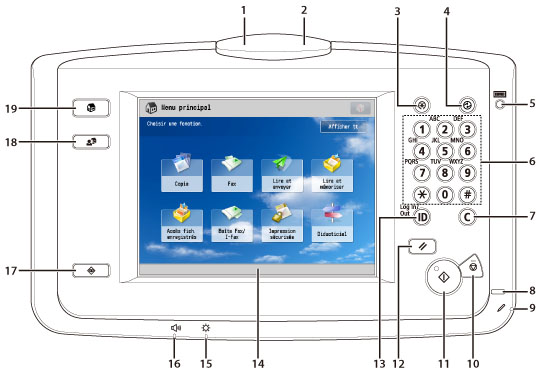 Comprend les touches, l'afficheur tactile et les voyants requis pour la manipulation de la machine. (Voir "Panneau de commande".)