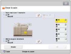 Un écran invitant à approvisionner la machine en papier s'affiche également si la cassette sélectionnée est mal introduite. S'assurer que la cassette est bien en place.