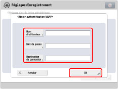 [Nom d'utilisateur] : Appuyer sur [Nom d'utilisateur] → saisir le nom d'utilisateur à utiliser pour l'authentification → appuyer sur [OK].