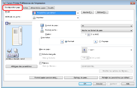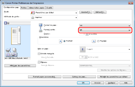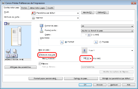La mise à l'échelle du document s'effectue automatiquement en fonction des paramètres définis dans [Format de page] et [Format sortie].
