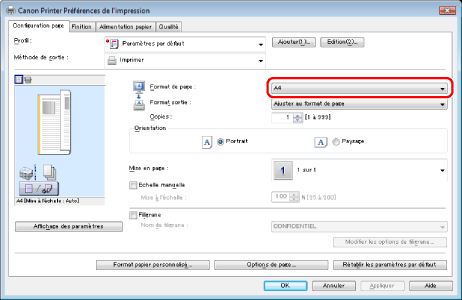 Dans [Format de page], sélectionner le format de page du document créé dans l'application.