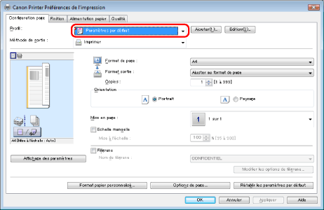 S'il n'est pas possible de choisir un profil, accéder à la boîte de dialogue des propriétés de l'imprimante à partir du [Panneau de configuration], cliquer sur l'onglet [Profil], puis vérifier si les options [Autoriser la sélection de profils] et [Autoriser la modification des paramètres] sont sélectionnées. Pour plus d'informations sur l'accès à la boîte de dialogue des propriétés de l'imprimante, voir " Définition des options de l'imprimante".