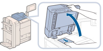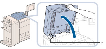 Nella macchina è presente un sensore di apertura/chiusura dell'alimentatore (area cerchiata nella figura). Per posizionare gli originali sul vetro di lettura, sollevare l'alimentatore di circa 300 mm, in modo che il sensore si stacchi dall'alimentatore. Se il sensore non si stacca dall'alimentatore, il formato degli originali potrebbe non essere rilevato correttamente.