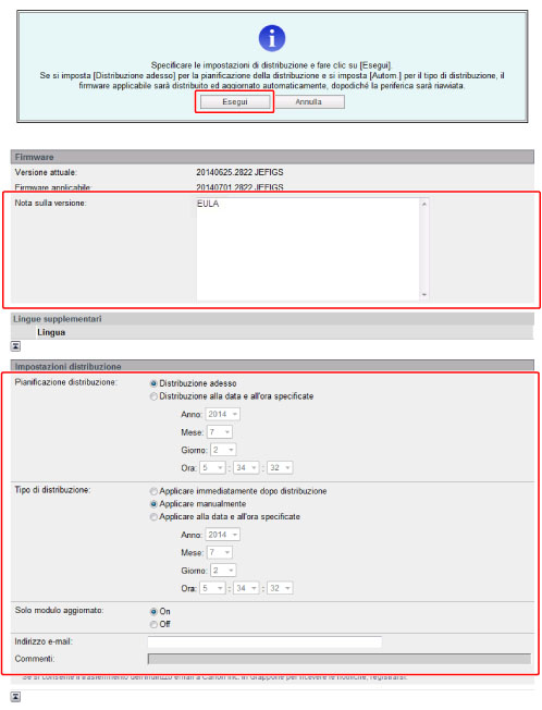 È possibile verificare il nuovo firmware applicabile alla macchina e indicare le impostazioni di distribuzione.