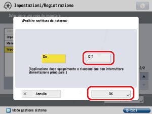 Per verificare se l'opzione [Proibire scrittura da esterno] è impostata su 'Off', attenersi alle procedure riportate di seguito.