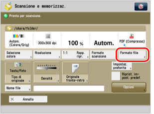 Se [Da formato PDF a formato PDF/A] in Impostazioni/Registrazione è impostato su 'On', non è possibile selezionare il formato Estens. funzionalità Reader.
