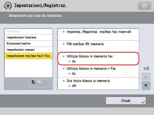 → [Impostazioni funzione] → [Ricezione/Inoltro] → [Impostazioni comuni] → [Impostazione mailbox fax/I-Fax] → [Utilizzo blocco in memoria fax].