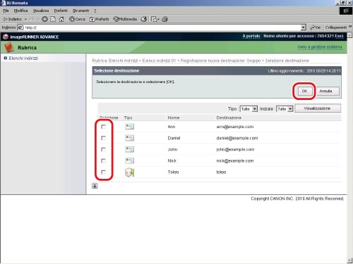 Selezionare gli indirizzi e-mail da registrare nel gruppo → fare clic su [OK].