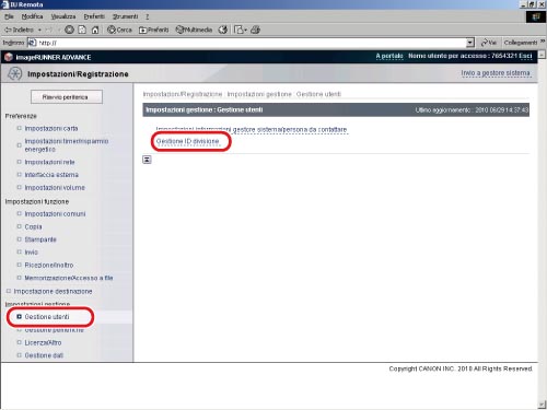 Accedere alla IU remota → fare clic su [Impostazioni/Registrazione] → [Gestione utenti] → [Gestione ID divisione].