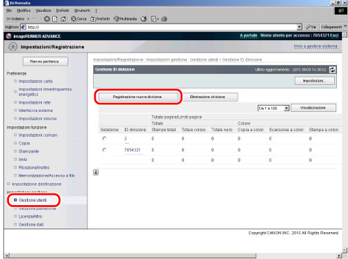 Accedere alla IU remota → fare clic su [Impostazioni/Registrazione] → [Gestione utenti] → [Gestione ID divisione] → [Registrazione nuova divisione].