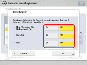 Questo modo consente di limitare l'utilizzo di certe funzioni da parte degli utenti, escludendo le funzioni di copia e stampa soggette alla Gestione ID divisione.