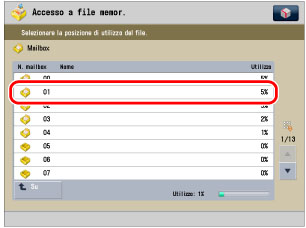 Nella schermata del menu principale, premere [Accesso a file memor.] → [Mailbox] → selezionare il numero di mailbox in cui è registrato il documento.