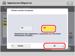 → [Impostazioni funzione] → [Memorizzazione/Accesso a file] → [Impostazioni Area di condivisione] → [Proibire scrittura da esterno].