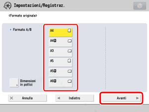 Selezionare il formato dell'originale che contiene il modulo immagine → premere [Avanti].