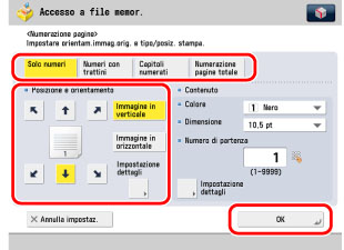 Selezionare il tipo di numerazione e l'orientamento e la posizione dei numeri di pagina → premere [OK].