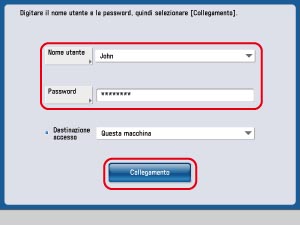 Immettere [Nome utente] e [Password] sulla schermata di accesso di una macchina in cui è installato iW Function Flow → premere [Cellegamento].