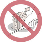 Se si nota del fumo o un rumore insolito provenire dalla macchina, spegnerla immediatamente con l'interruttore principale, scollegare il cavo di alimentazione dalla presa di corrente e chiamare un rivenditore autorizzato Canon. L'uso della macchina in presenza di condizioni anomale può causare incendi o scosse elettriche. Evitare inoltre di posizionare oggetti vicino alla presa a cui è collegato il cavo di alimentazione, in modo da poter scollegare velocemente il cavo quando necessario.