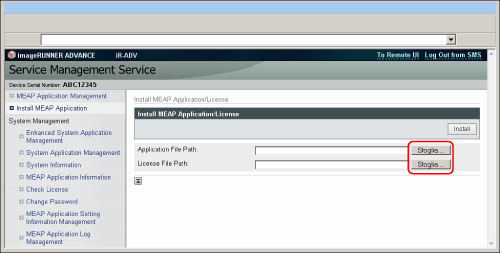 Seguire le istruzioni online per creare e scaricare il file di licenza. Per completare la procedura di generazione della licenza, è necessario il numero di accesso licenza e il numero (o i numeri) di serie della periferica MEAP (visualizzati in alto a sinistra nella schermata di SMS).