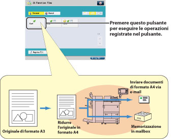 Per esempio, è possibile eseguire la scansione di un originale A3, ridurlo al formato A4 e inviarlo via e-mail, memorizzando anche un backup del file in una mailbox, tutto premendo un unico pulsante.
