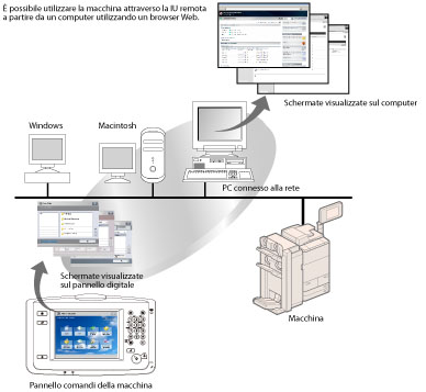 La IU remota consente di mettere in pausa e riprendere un processo, eseguire operazioni sui processi nella Mailbox RX memoria o nelle Mailbox fax riservati e specificare diverse impostazioni. Permette inoltre di impostare e utilizzare la macchina da un computer, invece di utilizzare il pannello comandi della macchina.